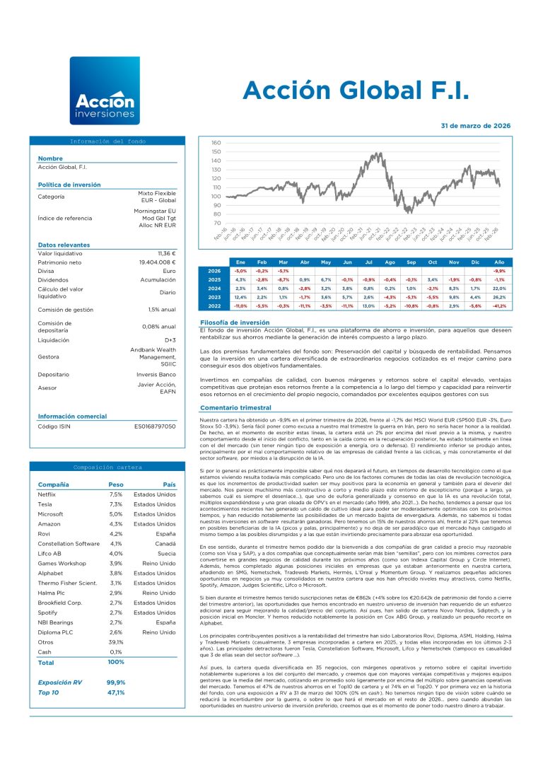Estimados partícipes, A continuación podéis consultar la ficha trimestral de nuestro fondo de inversión Acción Global, F.I. con los datos a marzo de 2026. En ella podéis ver la evolución de la rentabilidad, el Top15 actualizado de compañías en las que invertirnos y un comentario sobre los principales acontecimientos del periodo y los movimientos realizados en la cartera
