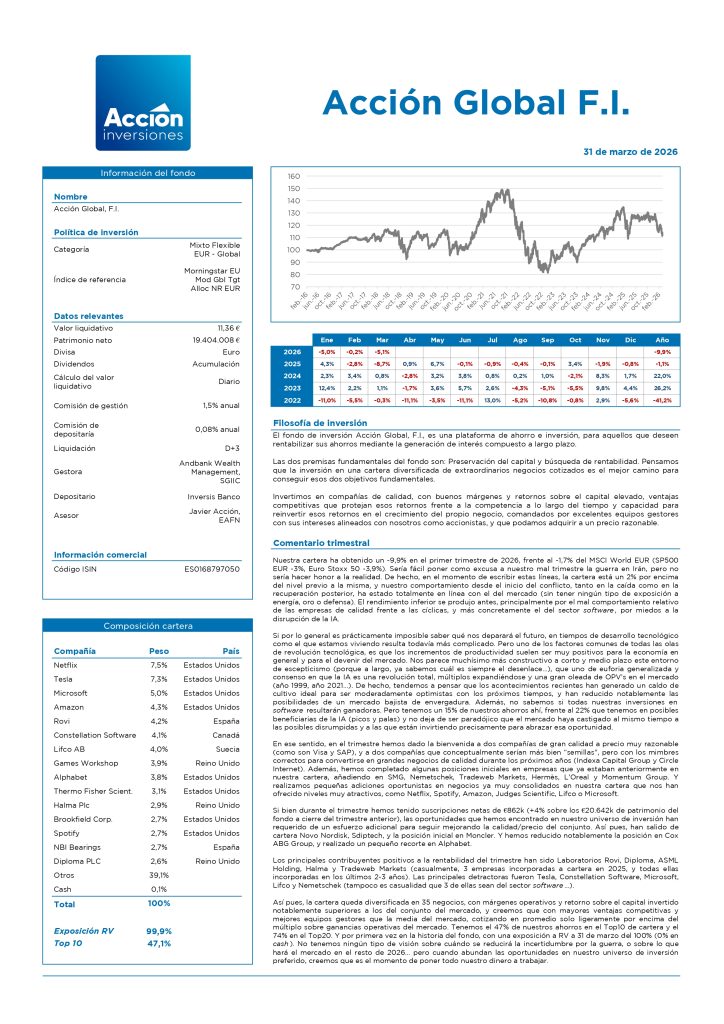 A continuación podéis consultar la ficha trimestral de nuestro fondo de inversión Acción Global, F.I. con los datos a marzo de 2026. En ella podéis ver la evolución de la rentabilidad, el Top15 actualizado de compañías en las que invertirnos y un comentario sobre los principales acontecimientos del periodo y los movimientos realizados en la cartera fondo.